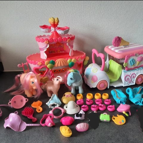 My Little Pony heste sæt med flere små Simba dukker og pony-figurer i forskellige farver. Sættet indeholder også tilbehør som spejl og en lille stol. Legetøjet er designet til børn og kan bruges til rolleleg og fantasifuld leg.