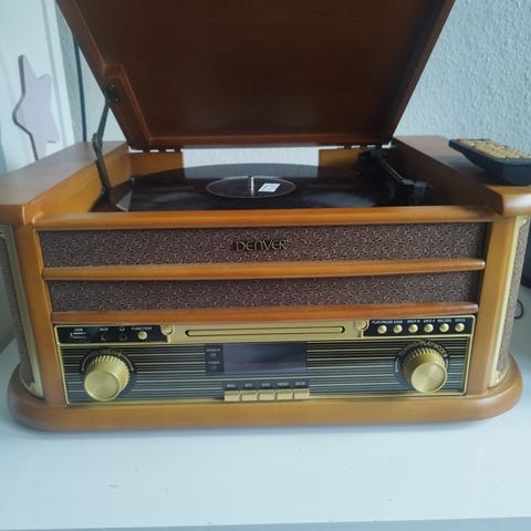Denver Pladespiller med indbygget radio og fjernbetjening. Enheden har et retro design med drejeskive og flere funktioner til afspilning af vinylplader. Leveres med brugermanual og fjernbetjening.Aux og USB samt kassebånds afspiller