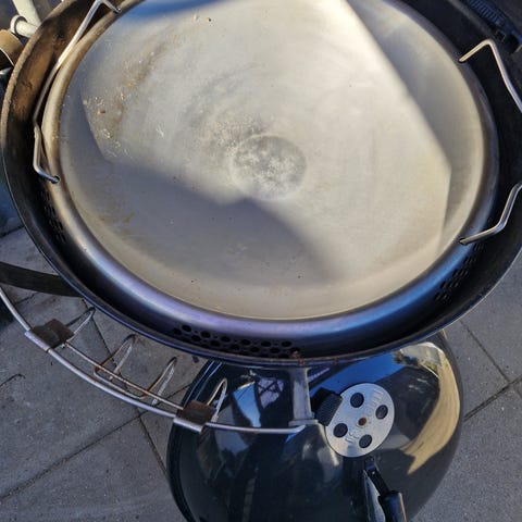 Rund kuglegrill 48 cm i rustfri stål med låg og grillrist. Står på ben med hjul og har håndtag, så den er nem at flytte rundt på terrassen.