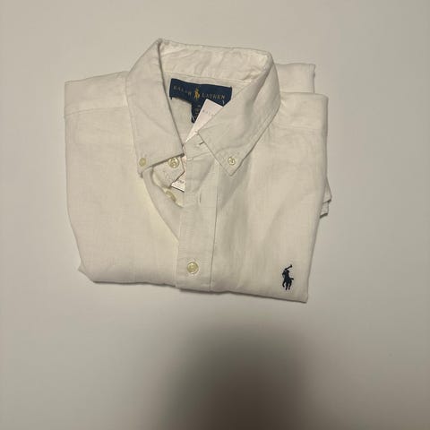 Hvid Ralph Lauren hør Skjorte til herre i størrelse L. Den har en klassisk knaplukning og broderet logo på brystet.