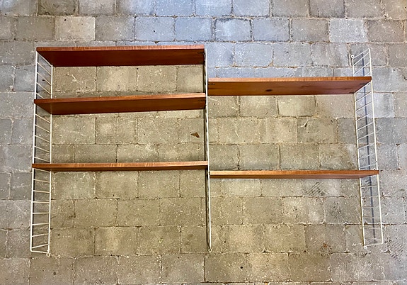 Væghængt reol system - med skriveplade og tidskriftholder - 3 brede hylder - 3 metal vanger - bemærk ligger skævt på billederne - ingen afslag -