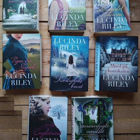 Sæt bestående af 8 romaner af Lucinda Riley: 'De syv søstre', 'Pigen på klippen', 'Mord på kostskolen', 'Sommerfugleværelset', 'Lavendelhaven' og 'Midnatsrosen'. Bøgerne er på dansk og tilhører skønlitteraturgenren mfl