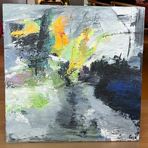 80 x 80 cm. akrylmaleri lavet af materialer fundet via DBA. Lærred har derfor smuk og unik underliggende struktur.