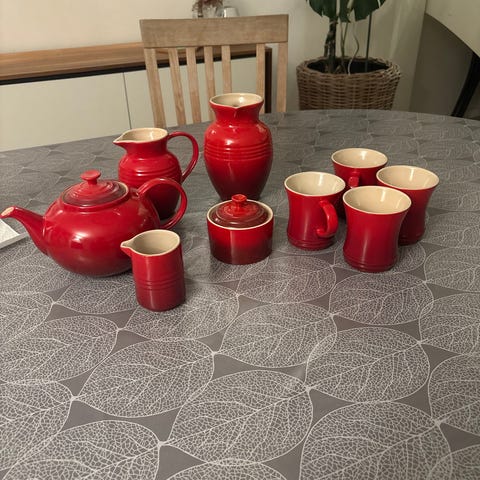Le Creuset tekande og kaffepresser i rød farve. Tekanden har en rund form med låg, og kaffepresseren har en cylindrisk form med låg og stempel. Begge er lavet af emaljeret støbejern eller keramik og egner sig til brygning af te og kaffe.