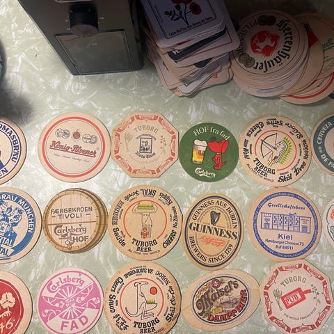 30 stk vintage Tuborg ølbrikker med reklame for 21 og 9 stk fra Søren Søgaards Billard Salon og Tartan Pub i Vejle
