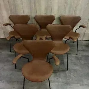 Originale Arne Jacobsen 7’er stol model 3207 med armlæn prof nypolstret i Hasselnød farvet semianilin læder og ny-pulverlakeret sort stel prisen er for 6 stk.