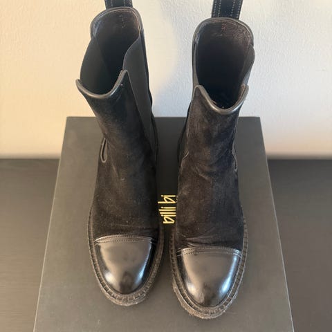 Sort varm støvle fra BilliBi i ruskind og læder med dekorative snøredetaljer, massiv gummisål.