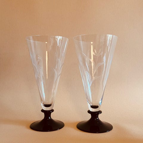 Den til højre fra fra serien Capri designet af Jacob E.Bang for Holmegaard i 1961. Højde 16,3 cm. Lidt mindre ridser, et lille stød (se foto) og lidt små pletter - nok kalk.
