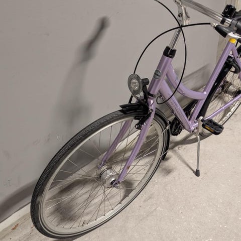 Winther Bycykel i lilla farve. Udstyret med bagagebærer og refleks bagpå. Egnet til daglig transport og bykørsel. 5 Gear. Købt i 1996. Er ikke blevet skånet. Men se fotos. Står meget flot endnu - uden rust på stel. - Den skal opdateres med ny sadel og nye dæk, men lige nu holder de luft. - Gear og kæde har jeg ikke forstand på, men det ser sundt ud. Cyklen har ikke været brugt i 10 år. Jeg tror det er et stærk stel - købt i en cykelhandel.
