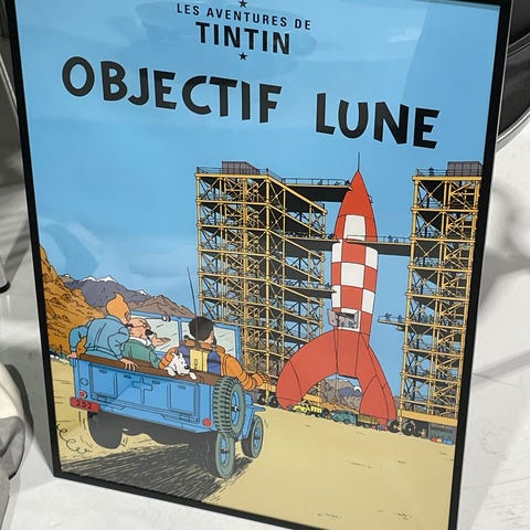 Hergé Les Aventures de Tintin plakat med motiver fra 'Reporter du Petit Vingtième au Pays des Soviets' og 'Objectif Lune'. Plakaterne er indrammede og viser ikoniske scener fra Tintin-serien.