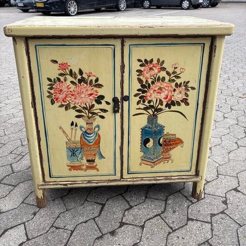 Produceret i Tianjin, Kina, fra 1950'erne, reproduktion i højeste kvalitet, brudeskab og kommode med kinesiske motiver og ornamenter, skader i hjørner men ellers fejlfri, befinder sig i Kalundborg, kan leveres