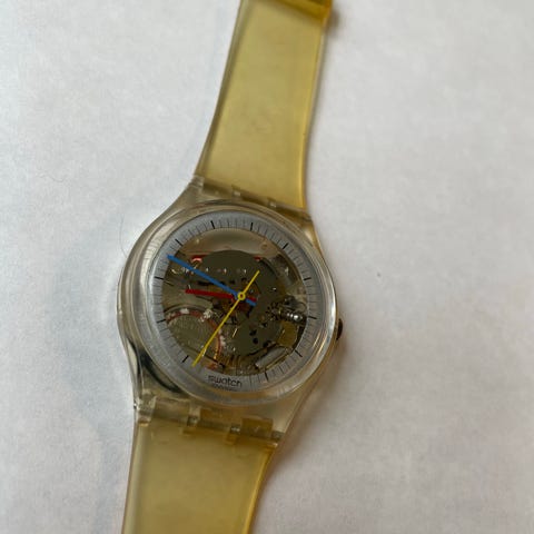 De farvede visere i orange og hvid giver flot kontrast til det mekaniske indre, og helheden gør uret til et markant eksempel på Swatch’ eksperimenterende 80’er-design. Et oplagt valg for samlere og dem, der elsker tydelig retrostil.