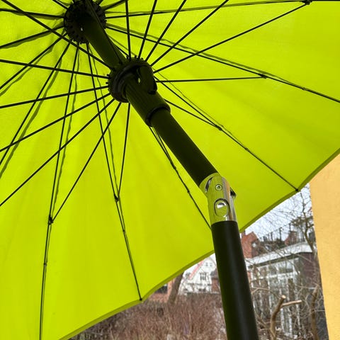 - Stabilt stel: Den stærke stang i hårdttræ med slidstærke ribber gør haveparasollen særdeles stabil og holdbar.