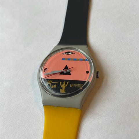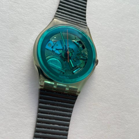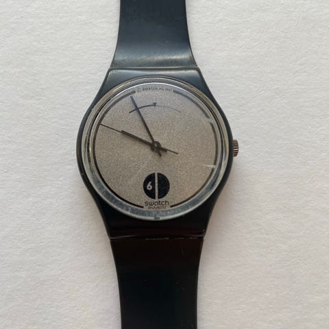 Grey Flannel er et stilrent og eftertragtet Swatch-ur fra 1986, kendt for sin karakteristiske grå “støj”-mønstrede urskive og farvede visere, der giver uret et tydeligt 80’er-udtryk. Modellen fremstår med normalt vintage-slid på rem og kasse, men fungerer som den skal og bærer sin alder flot.