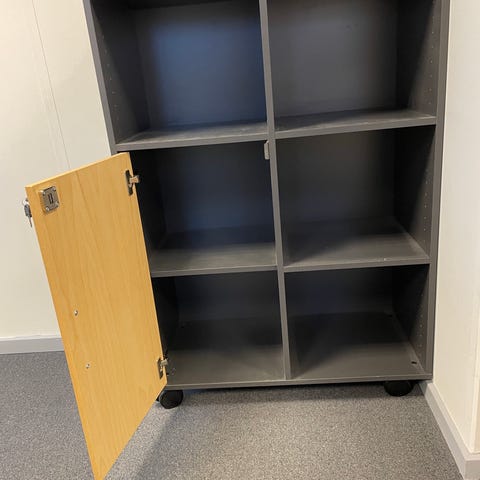 Træskab med fire skuffer i lysebrunt træmateriale. Skabet er designet til opbevaring og kan anvendes til kontor- eller hjemmebrug. Det har været brugt som arkivskab.