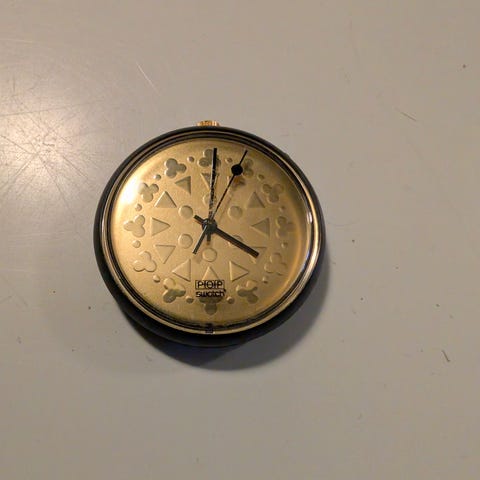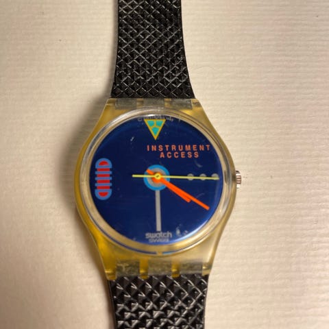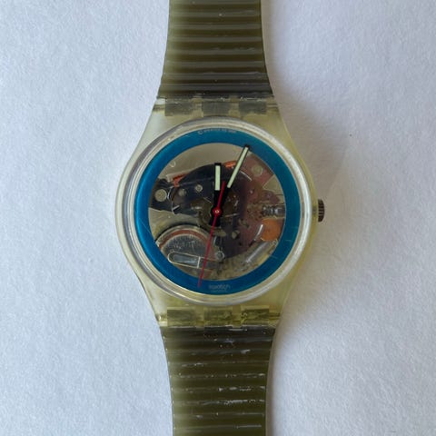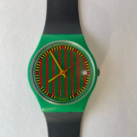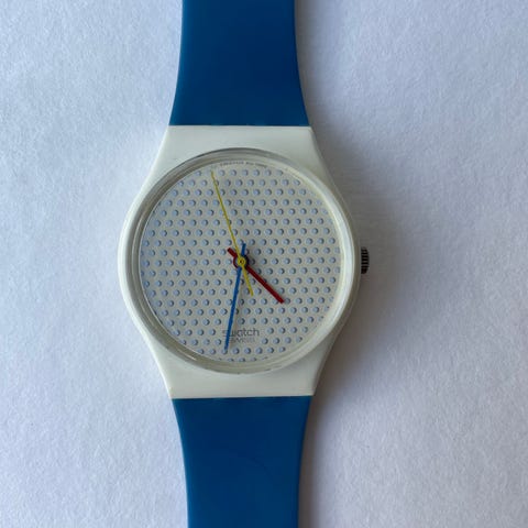 Swatch unisex ur med blå urskive med røde striber, sort rem og datovisning. Uret har et enkelt og tidløst design.