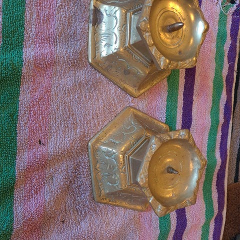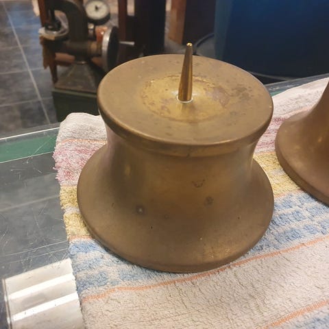messing lampe til store blok lys, messing, fin gammel messing stage/lampe til store blok lys, mål 33 cm høj 12 cm bred, er meget tung og massiv og med spyd i toppen til blok lyset