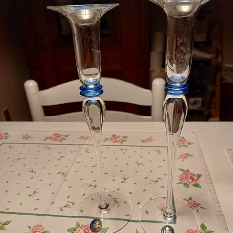 Sæt bestående af fem svingede glas lysestager i sort og hvid. Lysestagerne varierer i størrelse og har en unik snoet form. Materialet er glas, og de kan anvendes til dekoration og til at holde lys. Stagerne er hhv. 30 cm, 20 cm og 10 cm høje.