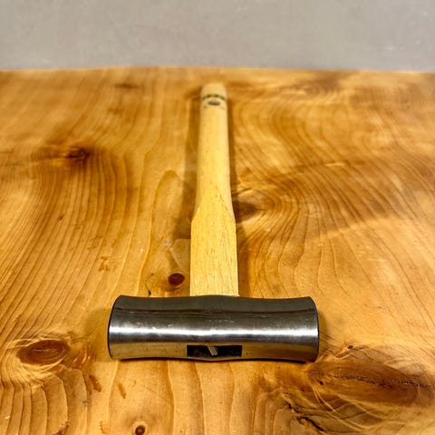Hammer med kobberhoved og træskaft. Designet til opgaver hvor skånsom behandling af materialer er nødvendig, da kobberhovedet mindsker risikoen for skader ved slag.
