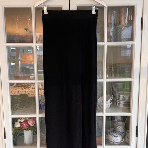 Smuk sort nederdel fra VILA, designet i et elegant, let skinnende materiale og pyntet med en flot sølvbroderet blomst, der giver et feminint og stilrent udtryk. Nederdelen har en let A-form og et lag af tyl i kanten, som giver et smukt fald og et diskret, festligt touch. Den fremstår i pæn brugt stand med enkelte små brugsspor (se billeder), men uden skader eller mangler.