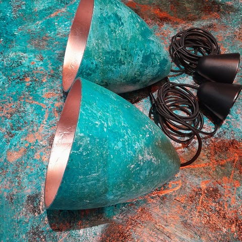 1 stk 'Tube' loftlampe håndmalet i irgrøn/ turquoise/ kobber med 3 meter sort tekstilledning samt E27 fatning max 40 watt + sort baldakin.