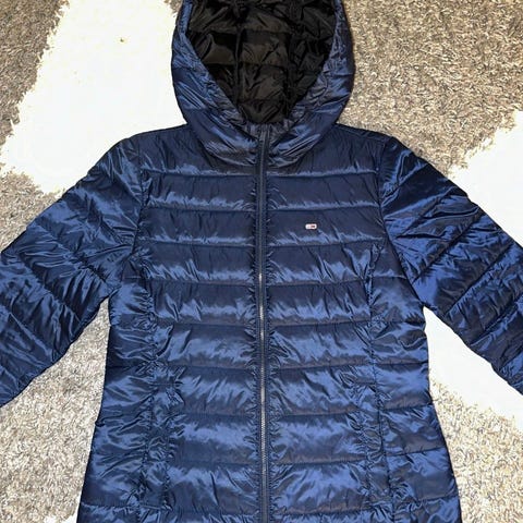 Virkelig skøn sort Tommy Hilfiger figursyet dame frakke i str M. Jakken er sort og fremstillet i polyester.