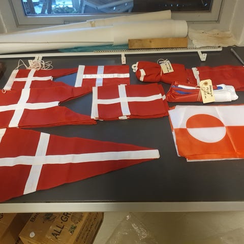 YF Dannebrog flag in red and white colors. The flag features a white Scandinavian cross on a red background with two pointed ends. Suitable for decorative or ceremonial use.