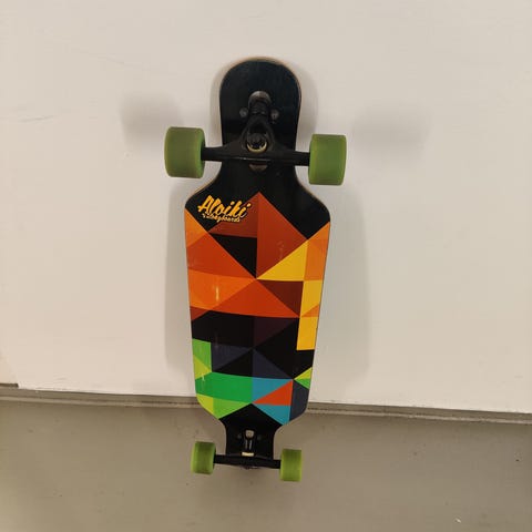 Oxelo Longboard med 7-lags trækonstruktion. Længde på 82,8 cm (32,6 tommer) og bredde på 19,7 cm. Designet med farverigt motiv på træoverfladen.