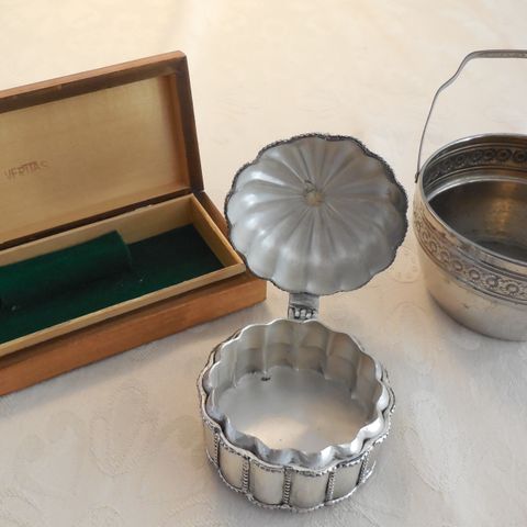 Nips kander, norsk pewter, har lidt ridser og en bule. Samlet 25kr