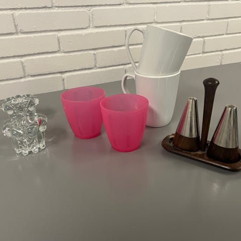 Vintage 1970’erne plastik køkkenudstyr sæt i orange farve. Sættet inkluderer kander med målemarkeringer, kopper, skeer og tallerkener, alle lavet af holdbart plastikmateriale. Velegnet til brug i køkkenet til servering og opbevaring.