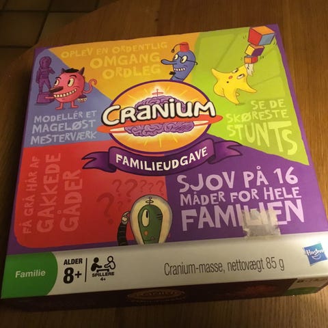 Cranium Familie brætspil med spilleplade, kort i forskellige kategorier (fakta, tegning, ord, skuespil) og spillebrikker. Egnet til familier og grupper, designet til at udfordre forskellige færdigheder gennem sjove opgaver. Nyt modellervoks