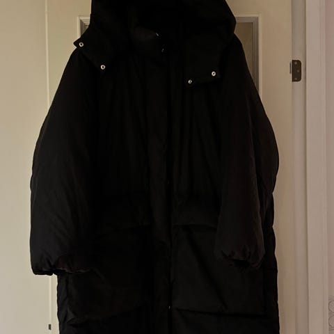 Beautiful black winter parka from H&M, featuring a warm fleece-lined hood and a slightly cinched waist that gives it a relaxed yet stylish silhouette. The coat is comfortable, warm without being heavy, and includes practical details such as large front pockets, adjustable waist, and a full zip with wind flap.