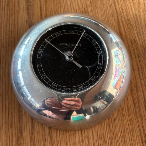 Barometer i rustfrit stål fra Georg Jensen, design Andreas Mikkelsen. Diameter ca. 11 cm.
