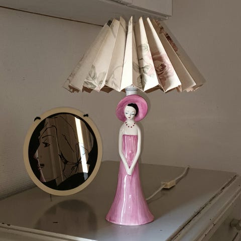 Porcelæn bordlampe med kinesisk motiv, dekoreret med farverige figurer og blomster. Lampen har en rund base i mørkt træ og en metalring øverst. Velegnet som dekorativ belysning i stuer eller soveværelser.