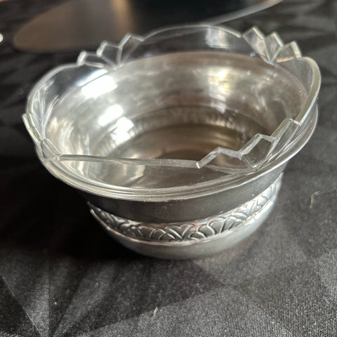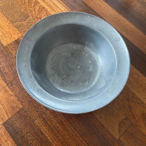 skål, tin, Tin eller lignende skål, jeg ved det ikke. Måler 21 cm i diameter uden hank og er 8 cm høj til låg.