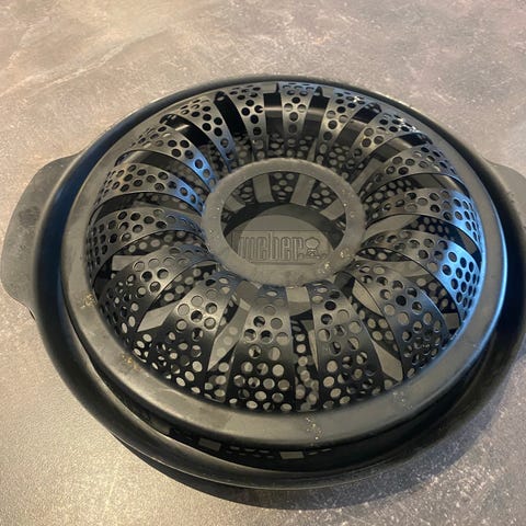 Weber holder til stegt flæsk, designet til at placere og tilberede flæsk på grillen. Fremstillet i robust materiale med perforeret indsats for jævn varmefordeling og fedtafledning. 36 cm i diameter med håndtagene
