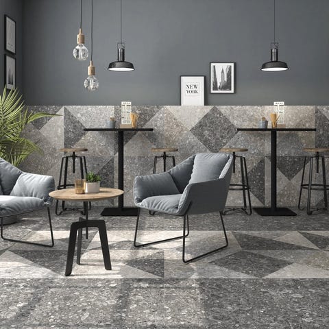 Eksklusiv flise med moderne, mat terrazzo-look. Kan bruges både på gulv og væg. Perfekt til badeværelse, køkken, entré og større opholdsrum.