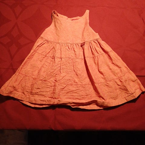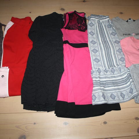 Kjolen er rød og har sidelommer og slids bagpå.