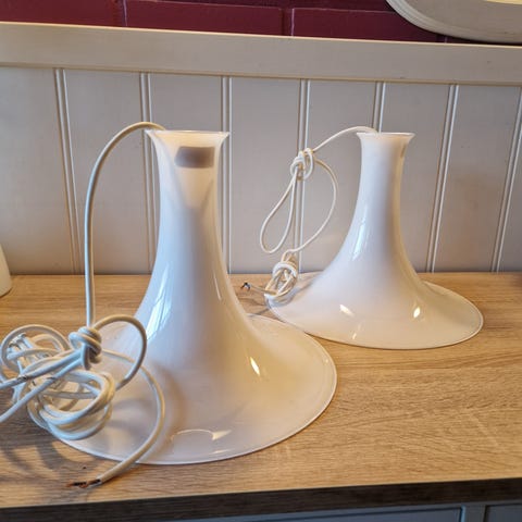 Lampen er i rigtig pæn stand og bærer det originale Holmegaard-mærke. Klassisk dansk design, som giver et blødt og behageligt lys og passer perfekt over spisebord, køkken, entre eller som hyggebelysning.