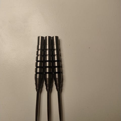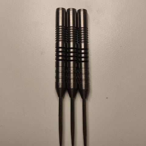 Minimum 80% tungstens dartpile. Kan ikke huske mærket, men jeg køber altid minimum 80% procent tungsten, så det kan også være 90%. Vægt 25g.