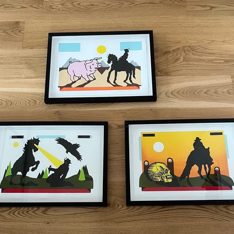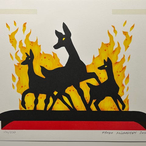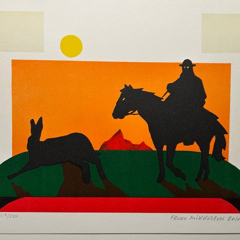 Frodo Mikkelsen - Litografi - grafiktryk fra 2010, nummereret 113/230. Motiv med sort kanin foran rød baggrund med gule og grønne elementer. Grafisk kunsttryk i farver på papir.