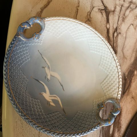 Bing & Grøndahl fad fra serien Offenback. Fadet har dekorative og flotte guldkanter, hvor alt guldet er intakt. Håndtag med hul-dekoration. Den måler 24 cm i diameter.
