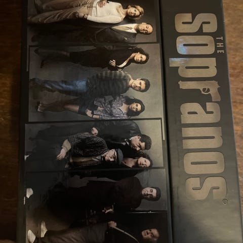 Sopranos DVD-sæt med flere sæsoner og episoder fra tv-serien Sopranos. Indeholder forskellige coverdesigns og episoder, der følger handlingen i serien.