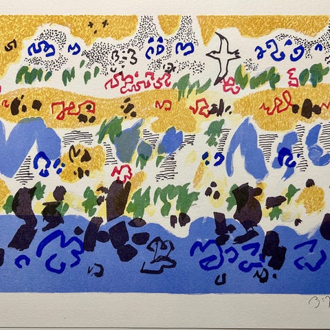 Original Litografi med farverigt landskabsmotiv. Trykket er nummereret 127/200 og signeret af kunstneren. Kunsttrykket er udført med detaljerede farver og former, der skildrer et abstrakt landskab med blå, gule og sorte elementer samt en hvid fugl i himlen.
