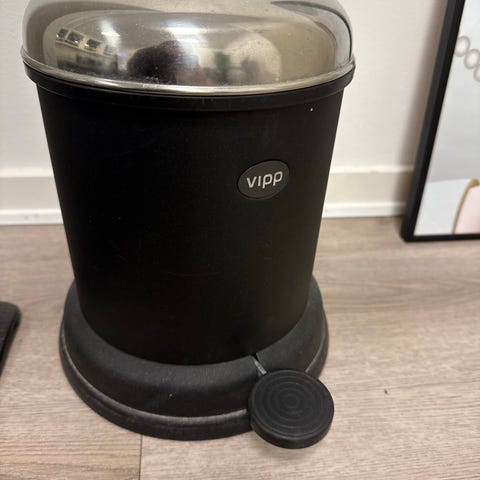 Vipp affaldsspand i hvid med låg i rustfrit stål. Affaldsspanden har en fodpedal for nem åbning og er designet til brug i køkken eller badeværelse.