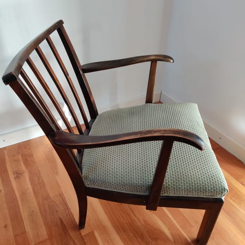 Den sorte armstol er næsten identisk med de to andre, den er også med løs sæde hynde i læder, men af et andet fabrikat, som jeg ikke kan finde.