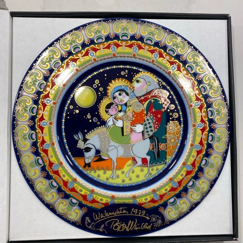 Rosenthal Bjørn Wiinblad Juleplatte med dekorativt motiv af en engel med musik. Tallerkenen har en diameter på ca. 21 cm og er fremstillet i porcelæn. Velegnet til samling eller udsmykning.