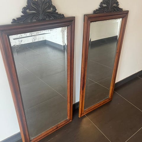 Fine gamle konveks-konkav-spejle der gør at motivet bliver smalt eller bredt. Sjove fx på et børneværelse eller i en entre mm. Originale gamle og helt intakte. Vintage men fine spejle. Flotte trærammer. Hurlumhej-huset. ( prisen er ialt for de to spejle) Ca 50x 65 cm.