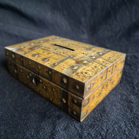 Blik sparebøsse ur med evighedskalender. Den har en del brugsspor og en del rust. Hullet bag på vides ikke om det er oprindeligt. Viserne er noget løse og der er en aflang bule bagpå som er svært at tage billede af grundet genskin. Låget er rustet fast og ikke forsøgt åbnet.