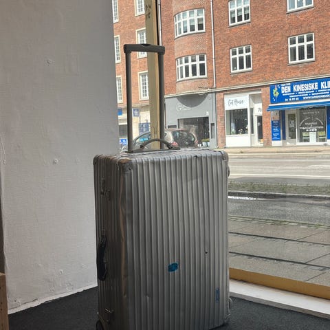 Stor Rimowa kuffert i god stand men med patina, som det hører sig til for en Rimowa kuffert der har været vidt omkring.